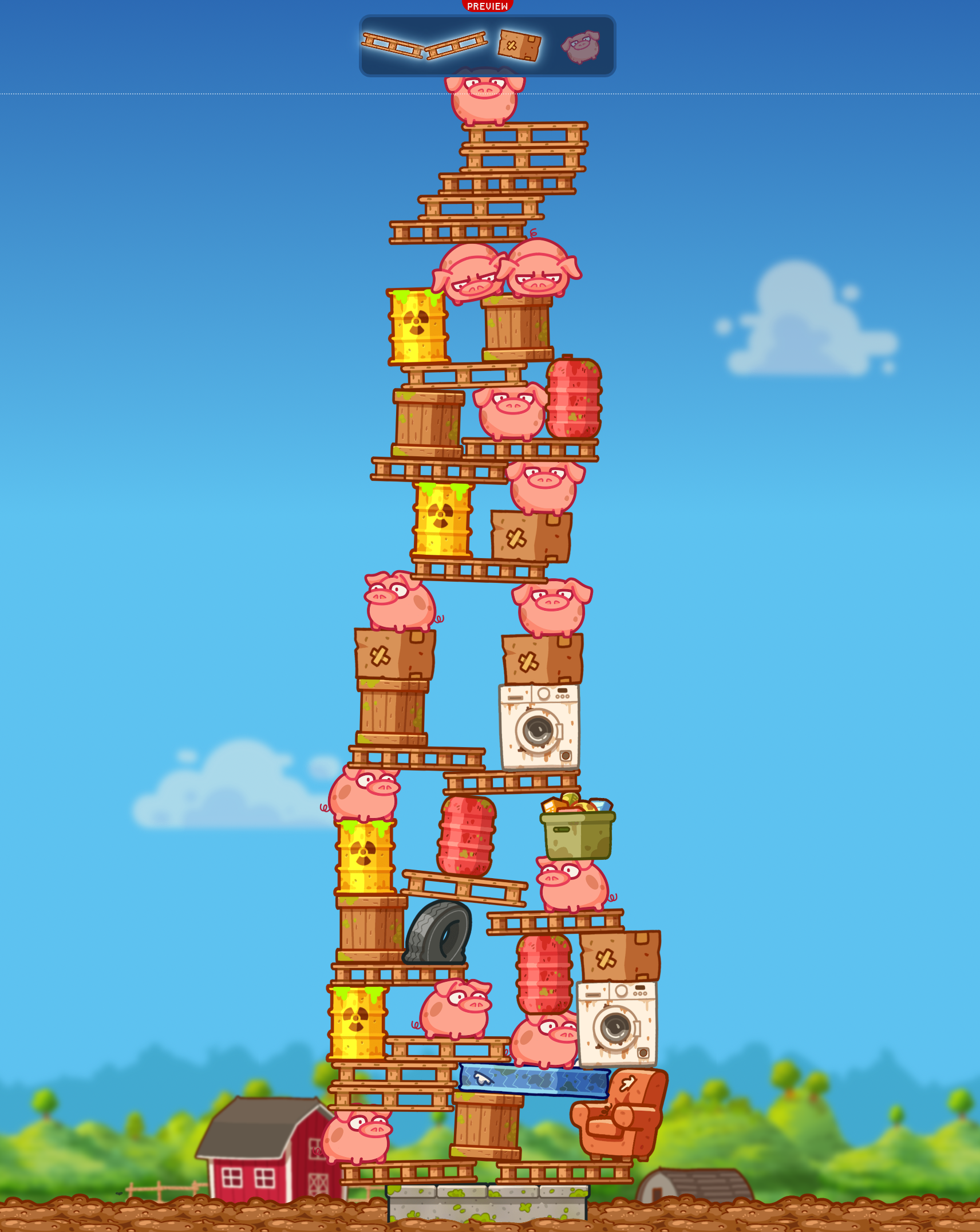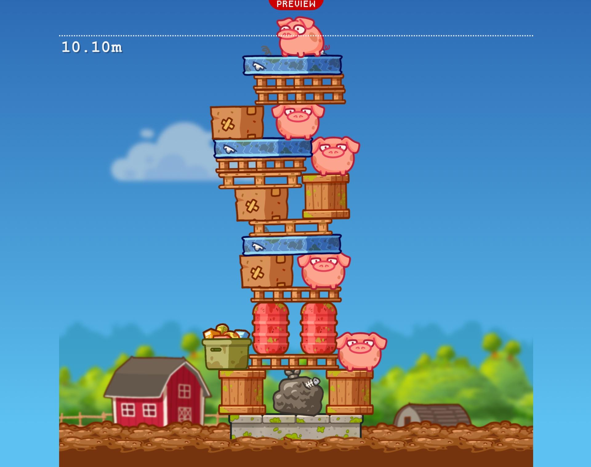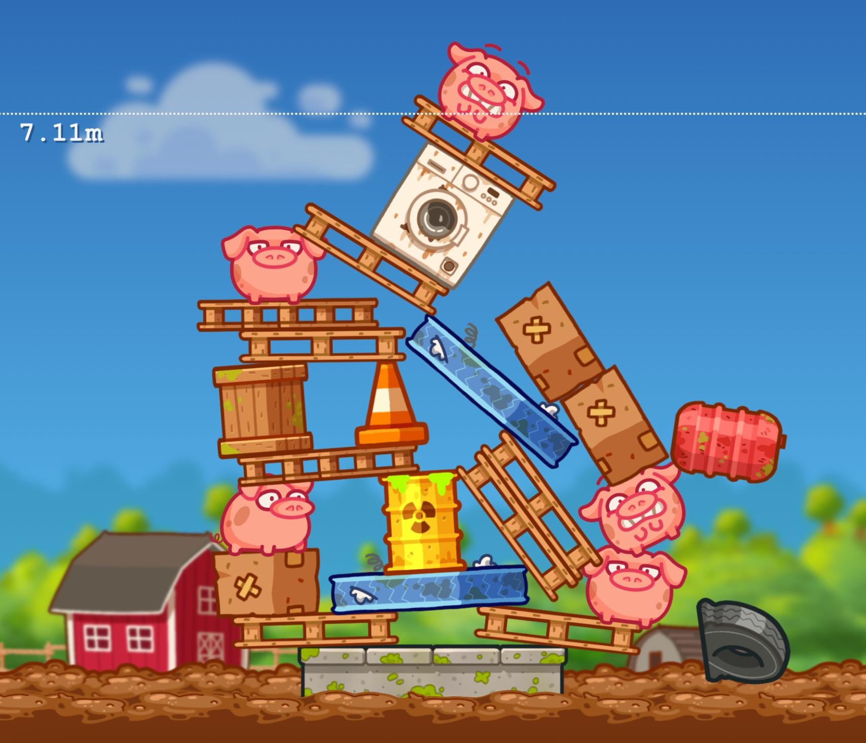 Help posh pigs rise high above the muck by building a tower out of junk